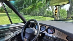 Tous les manomètres fonctionnent. La climatisation a été actualisée et un autoradio d’époque apporte une touche vintage supplémentaire tout comme l’antenne électrique.